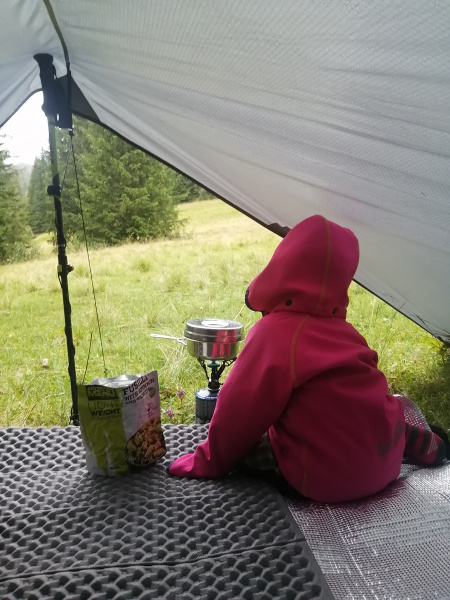 Darinka si trochu zapindala, že nechce večeři, ale horolezci prostě musí jíst, jinak by nemohli horolozit. Na tomto místě máme dokonce i signál, takže jsem poslala pár fotek do informační skupinky pro rodiče a za bubnování deště na stanovou plachtu jsme zalehly do spacáků. Fakt je to rovné! Měkké! Žádný hrb!