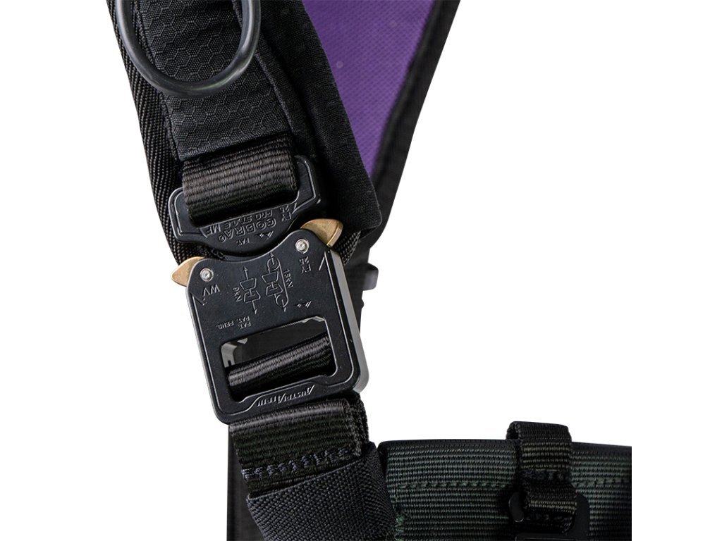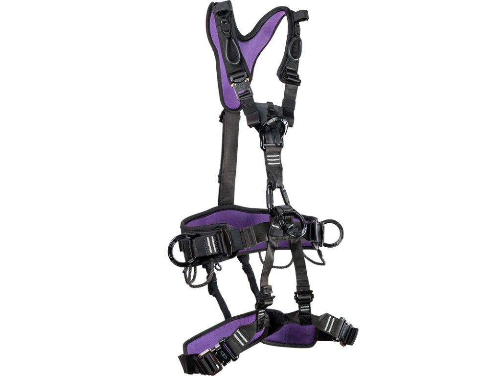 Pracovní polohovací komfortní postroj pro zachycení pádu s ramenními popruhy ve tvaru „X“.