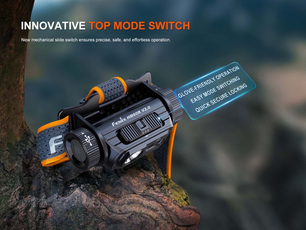 Fenix HM60R V2.0 je vysoce výkonná nabíjecí čelovka, která v hlavním reflektoru nabízí světelný tok až 1600 lumenů s dosvitem 170 metrů. Druhý reflektor s výkonem až 350 lumenů má světelnou stopu velmi širokou a plynulou s neutrálním odstínem světla s vysokým indexem kvality podání barev CRI >90 (Color Rendering Index). Mezi reflektory se přepíná inovativním posuvným voličem na horní straně čelovky s možností jejího uzamknutí. Čelovka disponuje také červeným světlem s výkonem až 20 lumenů. Součástí balení je i nabíjecí Li-ion akumulátor typu 18650 s kapacitou 4000 mAh, který se nabíjí přímo v čelovce přes USB-C konektor. Vzhledem k výbavě je vhodná pro profesionální použití, různorodé sportovní aktivity (turistika, kempování, běh, cyklistika, lyžování...), do podzemí, pro rybáře a další použití. Zaručeně vám skvěle poslouží v každé situaci! Celokovová konstrukce zajišťuje vysokou odolnost, optimální chlazení a zároveň je plně vodotěsná dle standardu IP68 až do hloubky 2 metry pod vodou.