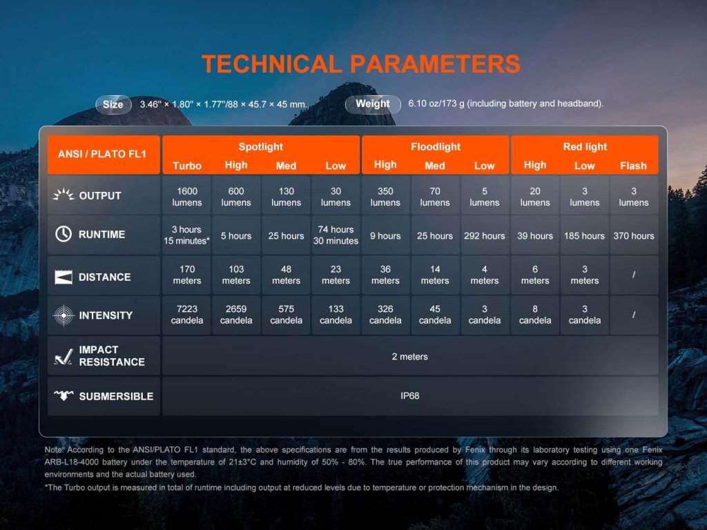 Všechny parametry svítilny (světelný tok, doba provozu na baterie, vodotěsnost, dosvit a nárazuvzdornost) jsou změřeny v souladu s normou ANSI/NEMA FL 1-2009.