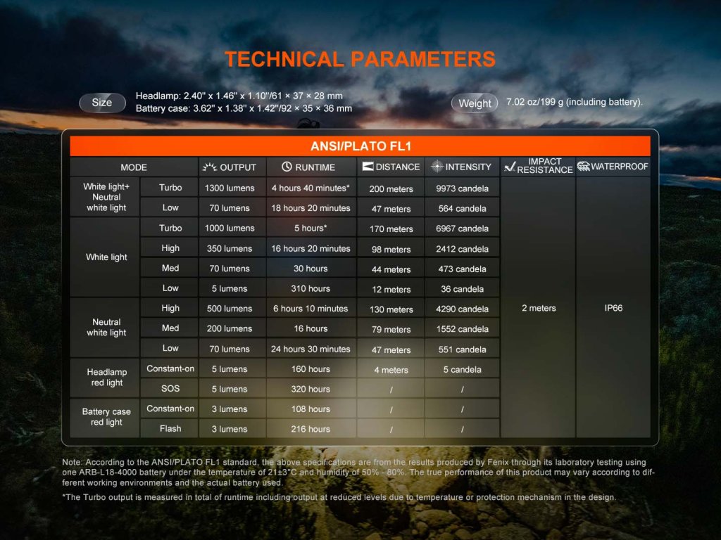 Všechny parametry svítilny (světelný tok, doba provozu na baterie, vodotěsnost, dosvit a nárazuvzdornost) jsou změřeny v souladu s normou ANSI/NEMA FL 1-2009.