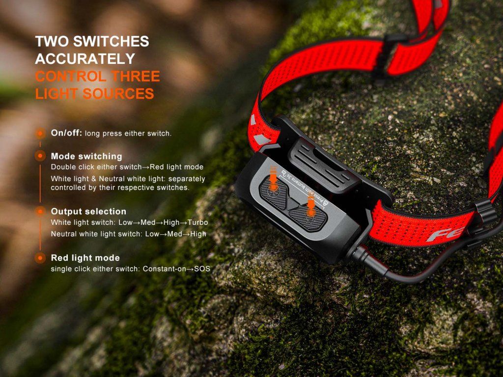 Zapnutí/vypnutí a přepínání režimů - chladnější reflektor se zapíná podržením pravého tlačítka (cca 0,5s), reflektor s neutrálním bílým světlem se zapíná podržením levého tlačítka (0,5s). Režimy výkonu se přepínají krátkým stisknutím tlačítka svítícího reflektoru. Světlo se opět vypne podržením příslušného tlačítka po dobu 0,5 s. Reflektory lze zapnout zároveň v turbo režimu (1300 lm) nebo v nízkém režimu (70 lm) stiskem tlačítka reflektoru, který potřebujeme k již rozsvícenému reflektoru přidat. Vypnutá čelovka se zapne do červeného světla dvojitým rychlým stiskem libovolného tlačítka a krátkými stisky se přepíná mezi režimem stálého svícení a blikání SOS. Zadní červené světlo / blikačka se zapíná podržením tlačítka na bateriovém pouzdře (cca 0,5s) a mezi blikáním a stálým svícením se přepíná jeho krátkými stisky.