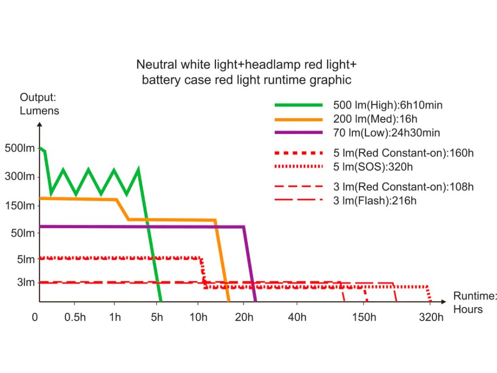 - 500 lumenů (6,16 hodiny) -> 200 lumenů (16 hodin) -> 70 lumenů (24,5 hodiny)