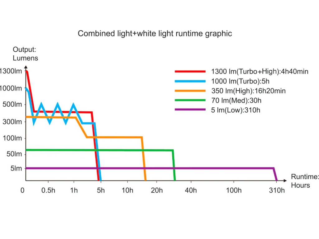 - 1000 lumenů (5 hodin) -> 350 lumenů (16,3 hodiny) -> 70 lumenů (30 hodin) -> 5 lumenů (310 hodin)