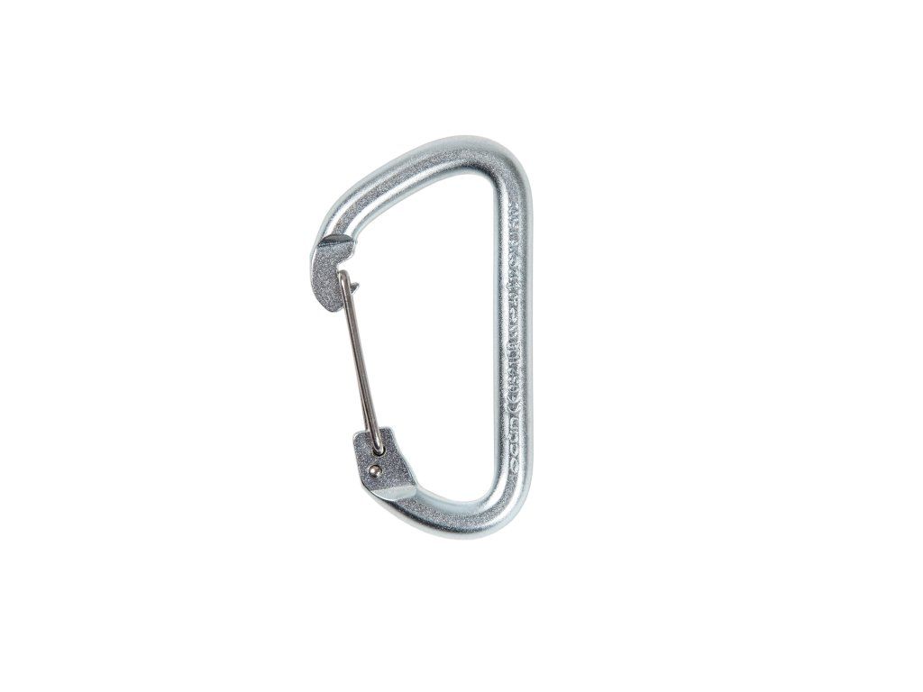 Ocelová karabina s drátěným zámkem určená pro použití na umělých stěnách.