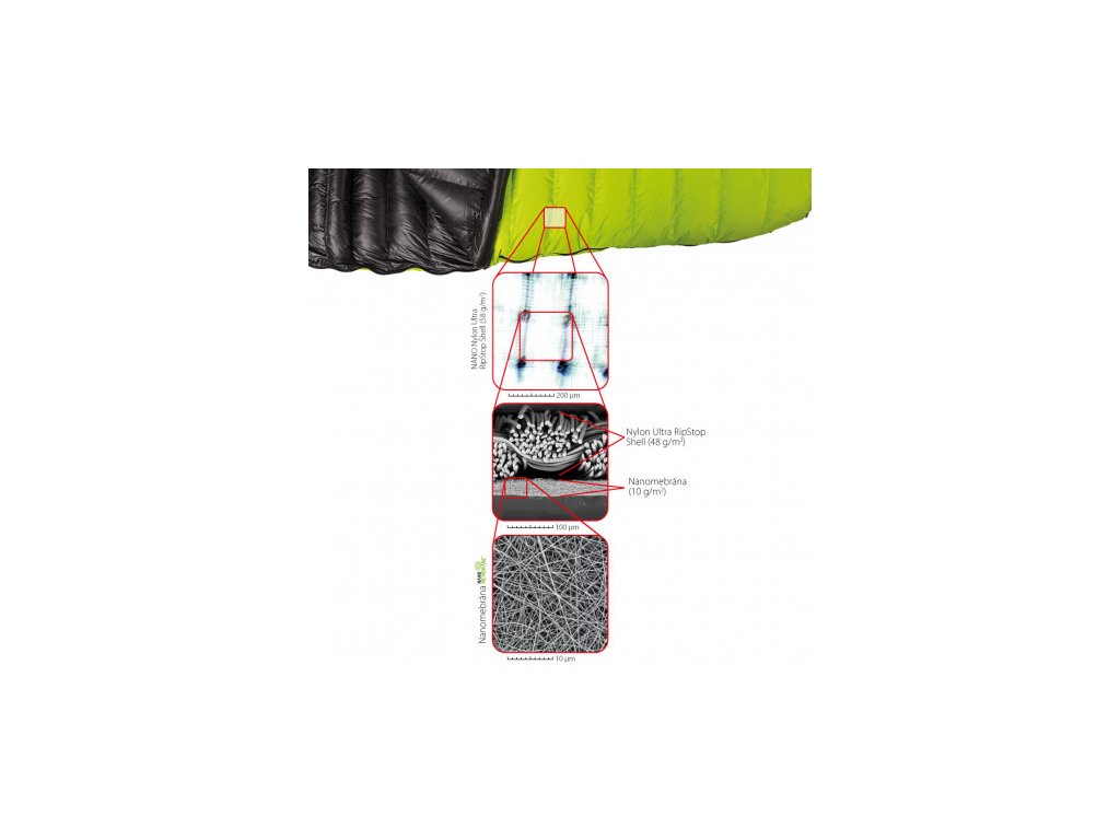 Náš vnější lehký materiál Ultra RipStop Shell o hmotnosti 58 g/m² s aplikovanou nanotechnologií zajistí paropropustnost (40 000 g/m²/24 hod.), prodyšnost -větruodolnost, voděodolnost (výška vodního sloupce 12 000 mm / 1 dm²). Jako vnitřní materiál je použit ultra lehký Nylon o hmotnosti 38 g/m², který je díky své jemnosti velmi příjemný na dotek.