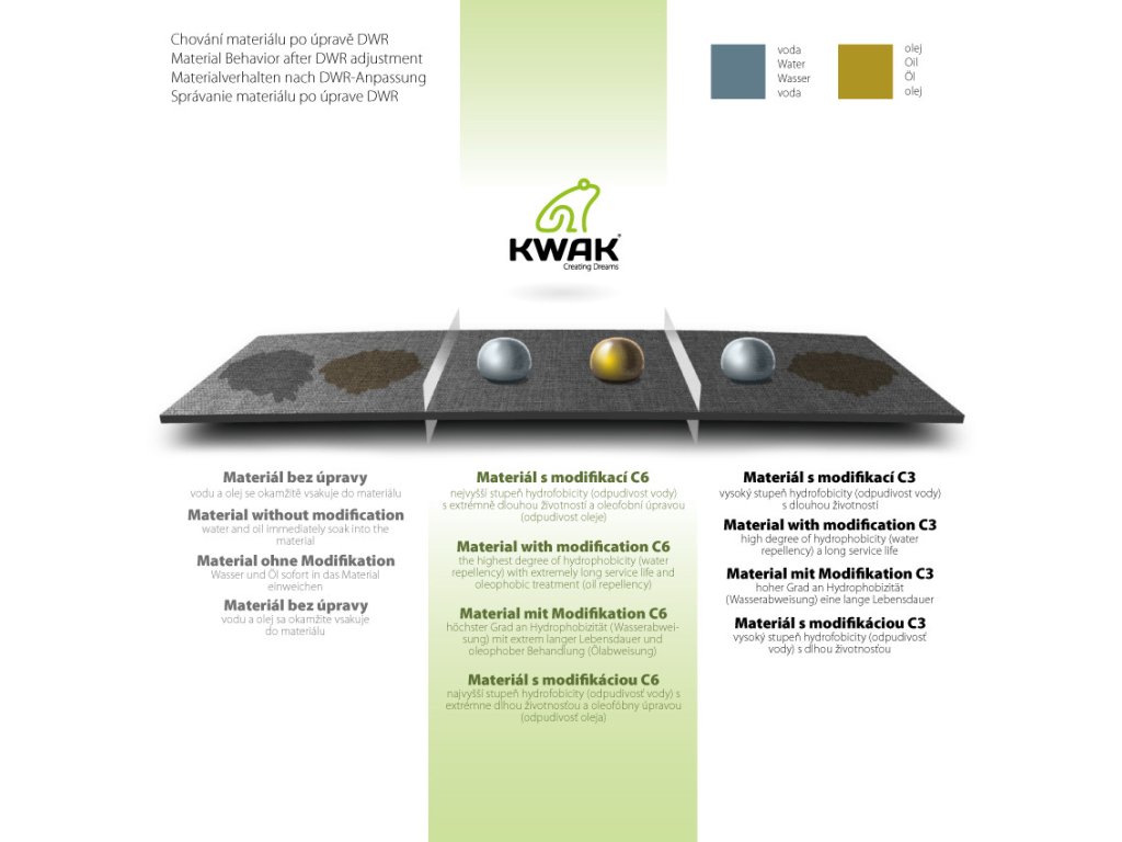 Povrchová úprava - Hydrofobní a oleofobní DWR C6 nejvyšší třída - lotosový efekt voda, olej, Fluorokarbon (PFC-no free)