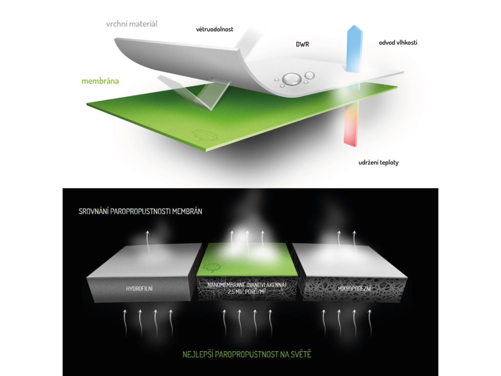 vnější lehký materiál Ultra RipStop Shell o hmotnosti 58 g/m² s aplikovanou nanotechnologií zajistí paropropustnost (40 000 g/m²/24 hod.), prodyšnost - větruodolnost, voděodolnost (výška vodního sloupce 12 000 mm / 1 dm²). Jako vnitřní materiál je použit ultra lehký Nylon o hmotnosti 38 g/m², který je díky své jemnosti velmi příjemný na dotek.
