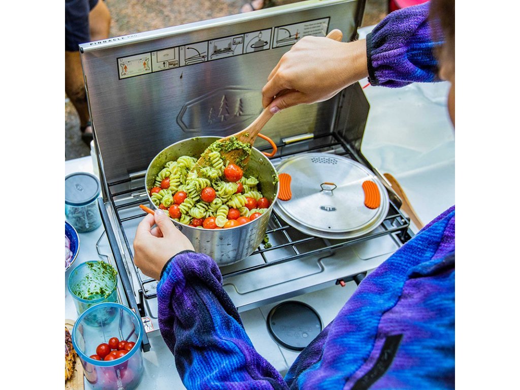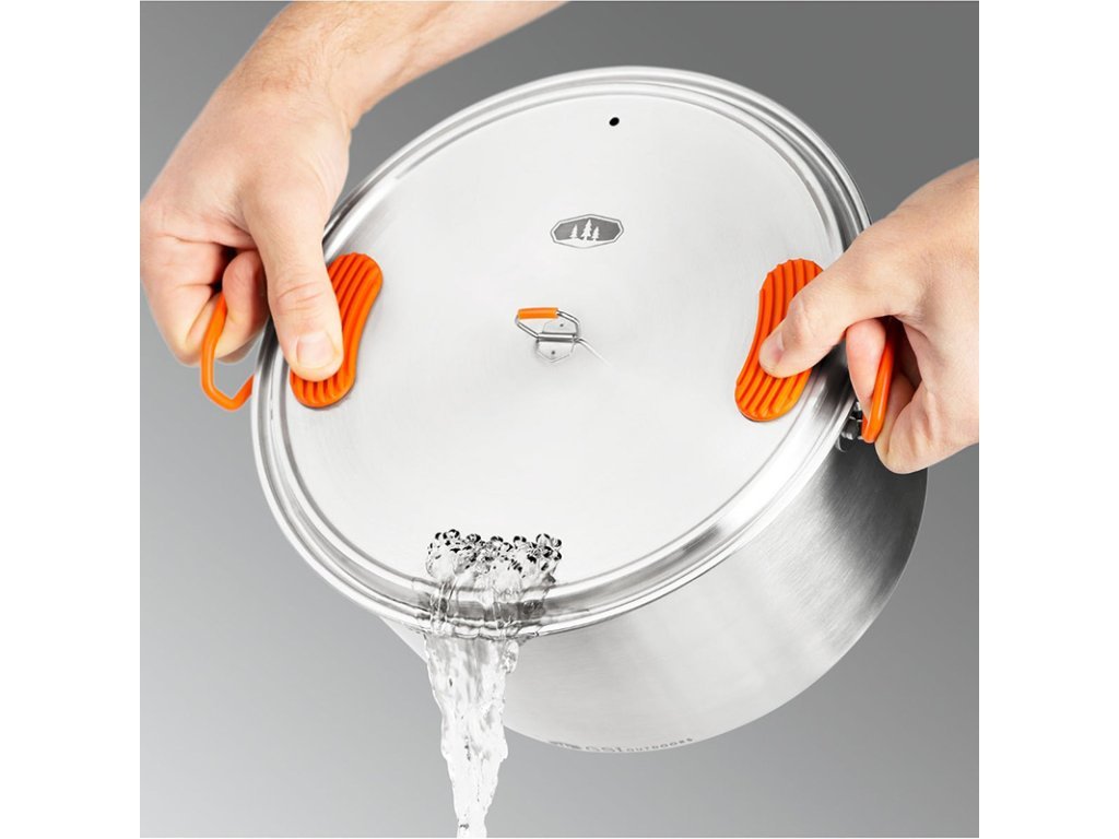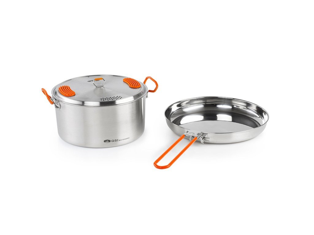 Sada nádobí z prvotřídní nerezové oceli 304 (18/8) Stainless steel. GSI Outdoors Glacier Cookset se skládá ze 3 litrového hrnce s perforovanou pokličkou a 9" (22,8 cm) pánvičkou se sklápěcím madlem. Dotykové části jsou proti popálení opatřeny silikonovou ochranou. Bezkonkurenční odolnost této oceli umožňuje vaření na jakémkoli zdroji tepla.