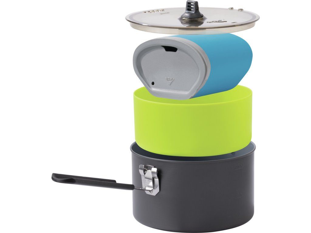 Lehká, skladní, praktická sada nádobí pro 1 osobu. Nádobí je vyrobeno z tvrzeného eloxovaného hliníku, s nepřilnavým keramickým povrchem (delší životnost). Plastový termohrnek má dvojitý plášť.