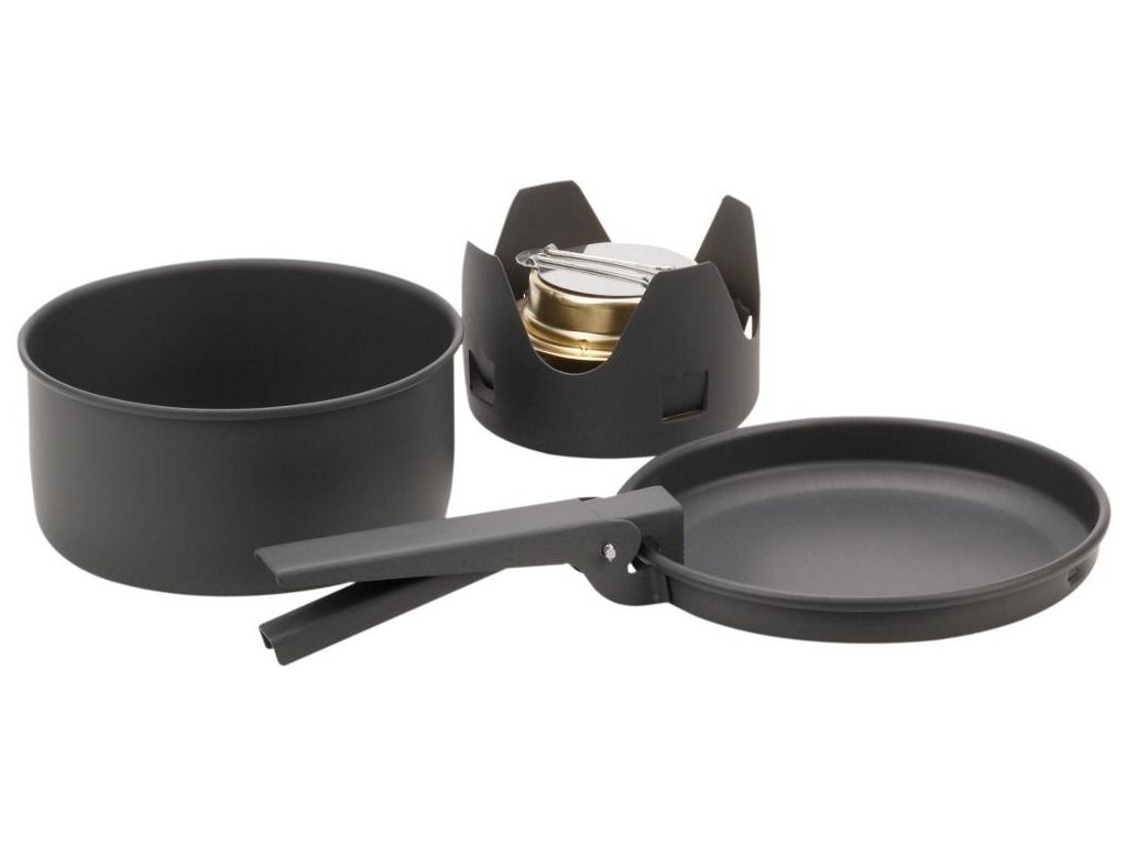Aluminiové nádobí pro 1 osobu s nepřilnavou úpravou a vařičem.
