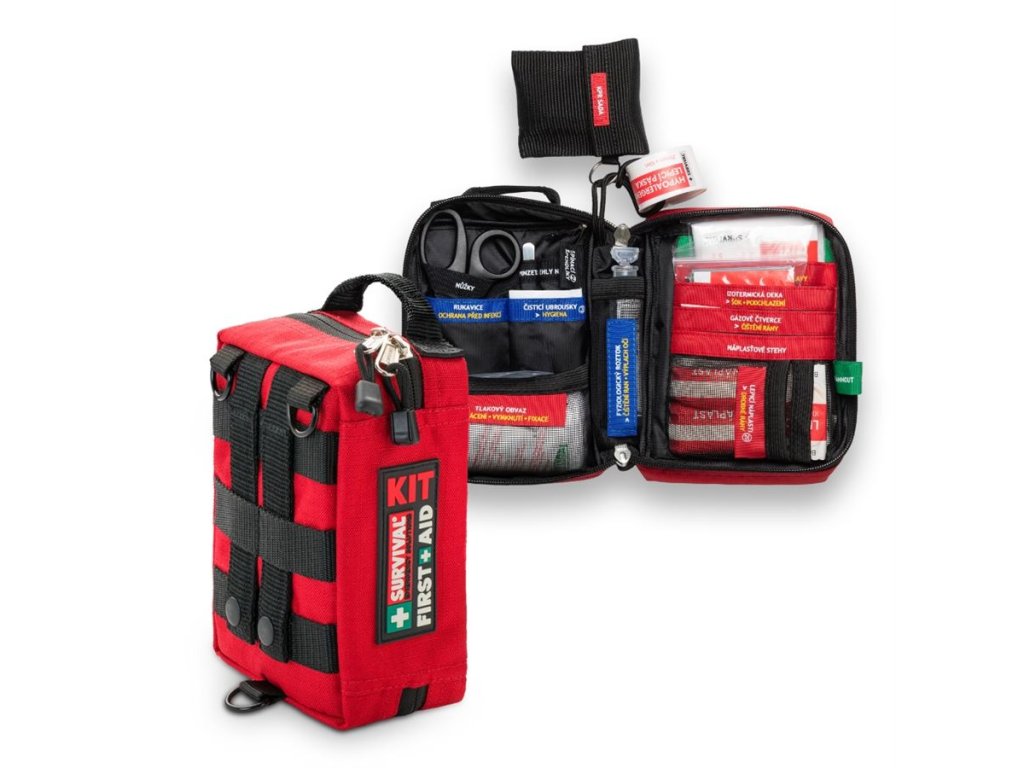 SURVIVAL First Aid KIT – Small je nejkompaktnější lékárnička z celé řady SURVIVAL, navržená pro každodenní nošení i rychlé použití na cestách. Přestože je malá, překvapí svým promyšleným systémem: výbava je rozdělená do barevně označených sekcí podle typu zranění a každá kapsa má jasně čitelný popis, díky kterému okamžitě víte, kam sáhnout.