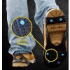Po vyndání nesmeků a jejich případném obrácení hroty směrem vně, nasaďte přední část nesmeku na špičku Vaší boty. Pak uchopte nesmek za nazouvací kruhový otvor v jeho zadní části a přiměřeným tahem směrem vzad a vzhůru jej natáhnete na botu. Zkontrolujte. zda nesmek správně sedí přes celou podrážku i podpatek boty. Totéž zopakujte i s druhým nesmekem.