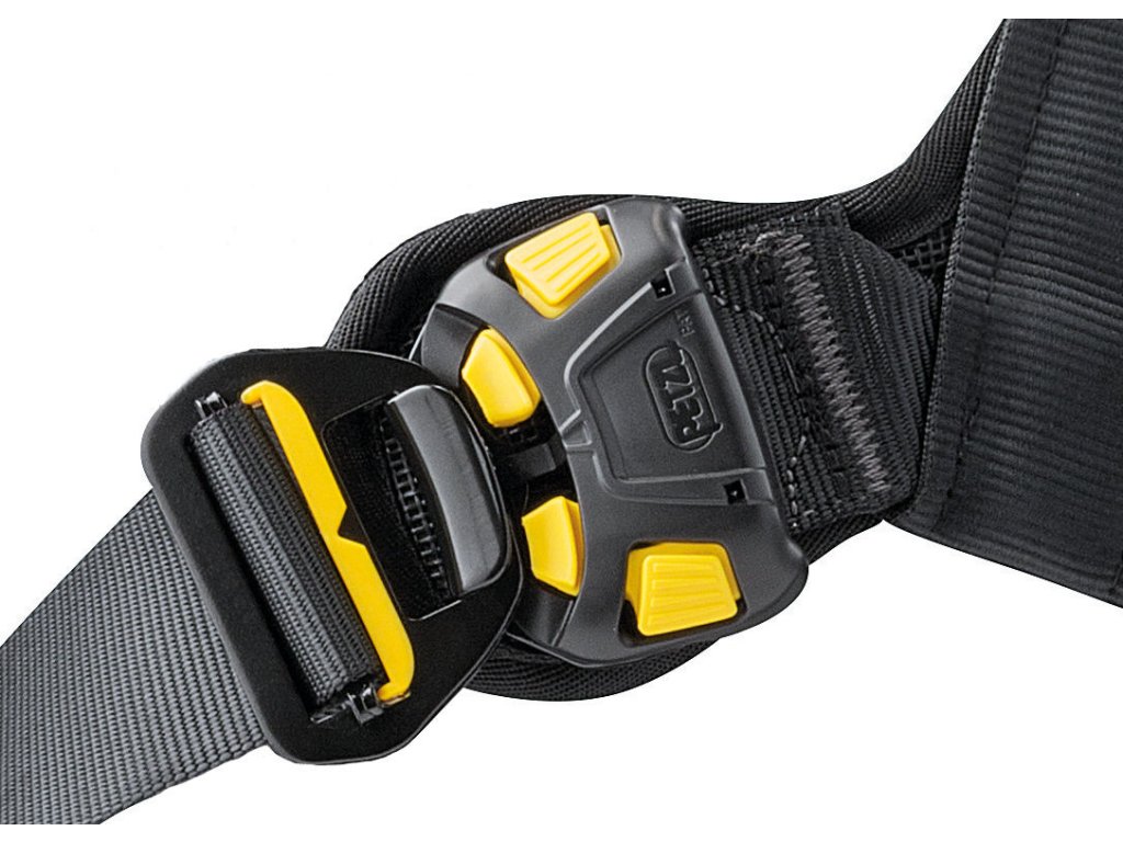 - Samosvorné přezky DOUBLEBACKna spojovacích páskách v zadní části postroje umožňují zkrácení vzdálenosti pásu a nožních popruhůpři použití zádového připojovacího bodu. V případě pádu toto nastavení zajistí větší rozložení zátěže do nožních popruhů, takže uživatel může zůstat pohodlněji zavěšen během čekání na záchranu