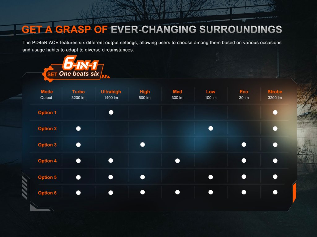 - Šest režimů výkonu: 3200 lumenů (2,3 hodiny) -> 1400 lumenů (3,3 hodin) -> 600 lumenů (5,5 hodiny) -> 300 lumenů (9,5 hodiny) -> 100 lumenů (30 hodin) -> 30 lumenů (57 hodin) -> stroboskop (3200 lumenů).