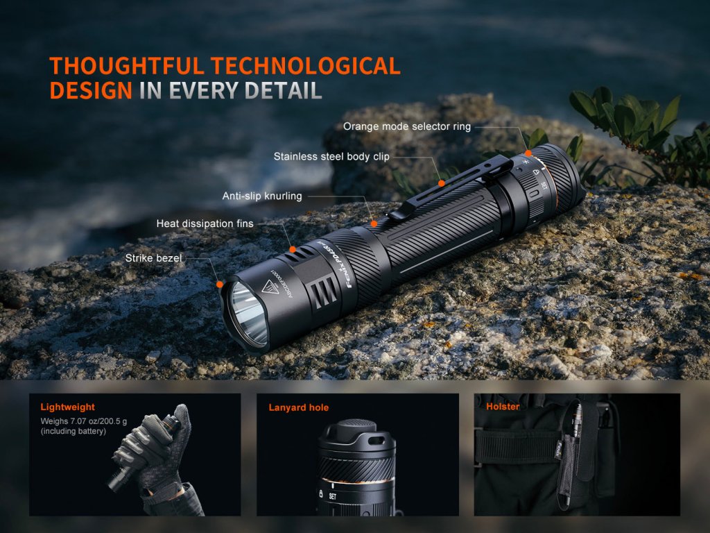 - Ke svítilně je přiložen akumulátor Fenix ARB-L21-6000, nabíjecí kabel USB-C, šňůrka na zápěstí, pouzdro na opasek a náhradní o-kroužky.
