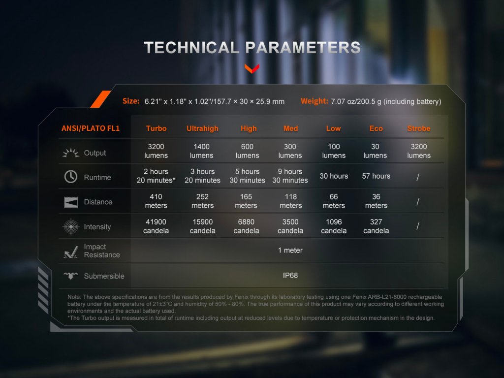 Všechny parametry svítilny (světelný tok, doba provozu na baterie, vodotěsnost, dosvit a nárazuvzdornost) jsou změřeny v souladu s normou ANSI/NEMA FL 1-2009.
