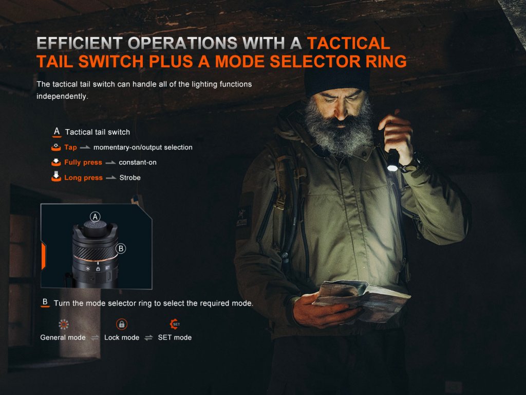 - Taktický vypínač na konci svítilny (funkce programování režimů, uzamknutí svítilny, okamžitého zapnutí/vypnutí - momentary on/off).