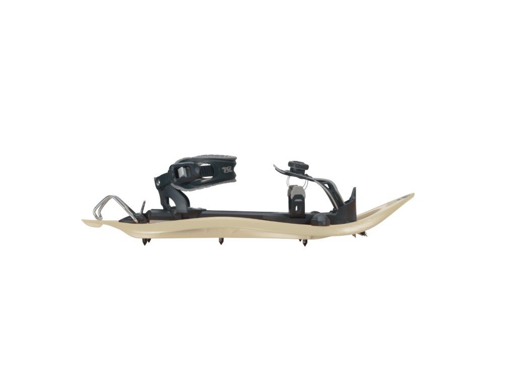 - 3D design rámu – jednolitý výlisek rámu z kvalitních plastů „Made in French Alps“. Obsahuje 6 hrotů z nerezové oceli, které lze vyměnit.Tři hladiny kontaktu se sněhem zabezpečují plnou funkčnost sněžnice bez ohledu na druh sněhu a v traverzech budeš mít jistotu. Na tvrdém sněhu a ledu jsou v kontaktu jen ostré hroty, ale pokud jdeš po ufoukaném sněhu, začínají zabírat i vylisované příčníky a sněžnice nepodkluzují. V měkkém zabírá celá plocha sněžnice včetně obloukového okraje a neboří se, ani nepodkluzují.