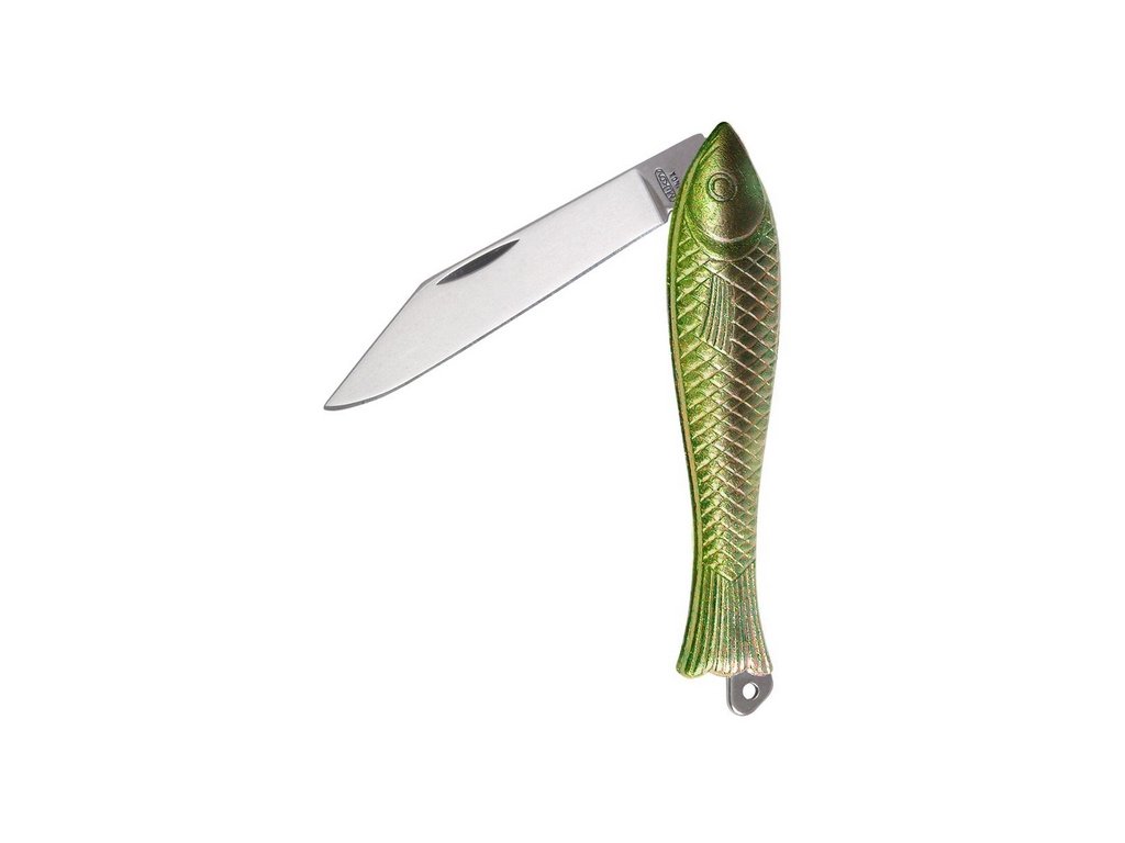 Tradiční zavírací nůž RYBIČKA s jednou čepelí a pouzdrem z PVC. Nůž "rybička" a jeden ze symbolů naší země - převážně si ji všichni spojujeme s dětskými léty - je to jeden z mála výrobků světa jenž dokázal oslovit ( a stále oslovuje) generace lidí, beze změny tvaru již několik desítek let (odhadem již 100let) - rybička je nostalgická záležitost, u které máte záruku že vyloudí na tváři obdarovaného úsměv. Čepel nože je z nerezové oceli 420 o tvrdosti 55HRC. Střenka nože je vyrobena ze zinku. Verze rybičky ve zlatém (imitace) provedení střenky. • počet funkcí: 1• čepel: 80mm• rozměr: 78mm x 11mm (zavřený)• hmotnost: 30g